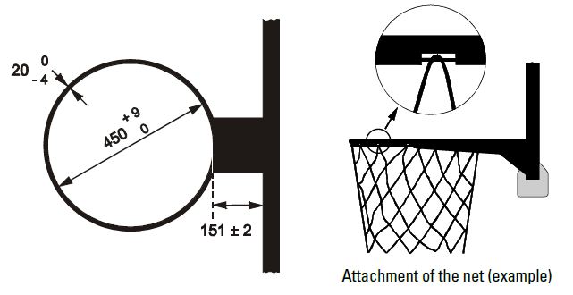 - Tidak hanya tinggi ring bola basket yang harus diperhatikan, Ring bola basket itu sendiri harus sesuai aturan. Ring merupakan keranjang berbentuk bundar, ini menurut FIBA, dan harus dibuat dengan material solid steel (besi). Diameter ring basket standar adalah 450mm-459mm.